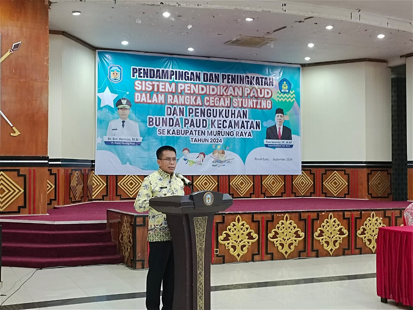 PURUK CAHU, RAKYATKALTENG.com – Pj Bupati Murung Raya (Mura), Hermon didampingi Pj Ketua Tim Penggerak Pemberdayaan dan Kesejahteran Keluarga (TP PKK) secara resmi membuka Kegiatan Pendampingan dan Peningkatan Sistem Pendidikan PAUD dalam rangka cegah stunting, di Gedung Pertemuan Umum Tira Tangka Balang, Jumat (20/9/2024).